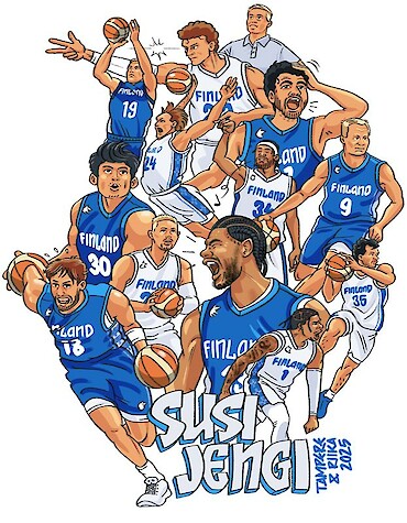 Susijengin yllettyä historialliseen nelossijaan, Kyrö pääsi heiluttamaan kynää uuden pikatilauksen merkeissä. Hän piirsi uniikin kuvituksen Susijengin EuroBasket 2025 -muistopaitaan.